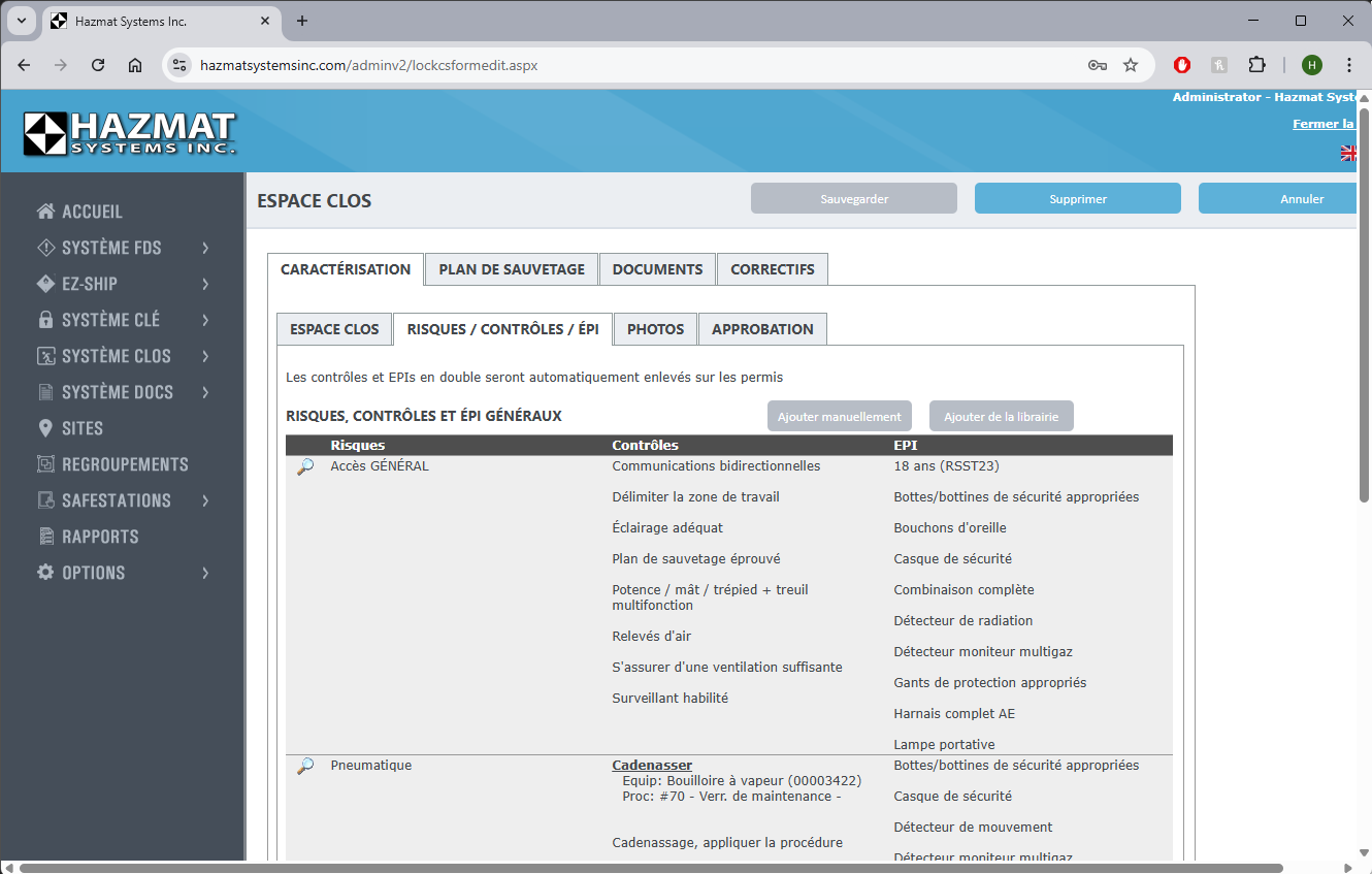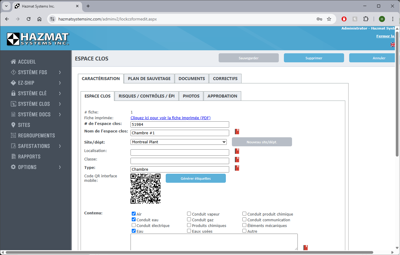 - Ajouter des documents supplémentaires (manuels, procédures) liés à chaque espace clos