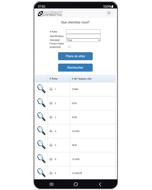 Notre interface mobile extrêmement conviviale s'adapte à n'importe quel appareil mobile et vous permet de consulter des informations sur tous vos espaces clos directement depuis votre lieu de travail