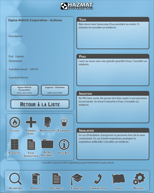 - Relié à notre module Système FDS, accédez à vos FDS et aux FDS simplifiée (premiers secours, manipulation, classifications, équipements de sécurité, etc.) en quelques secondes