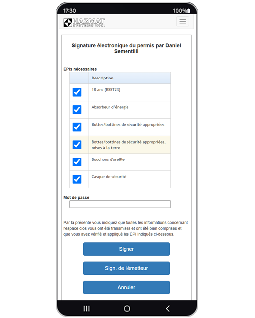 Demander aux travailleurs de signer le permis de travail en espace clos directement sur leur téléphone ou leur tablette