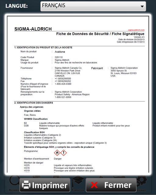 - Relié à notre module Système FDS, accédez à vos FDS et aux FDS simplifiée (premiers secours, manipulation, classifications, équipements de sécurité, etc.) en quelques secondes